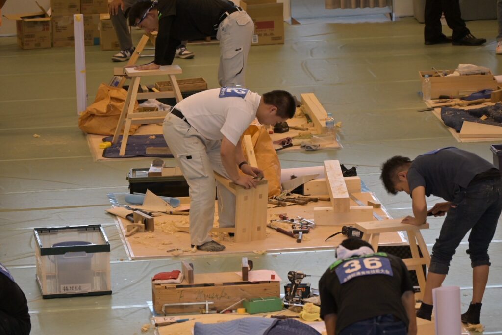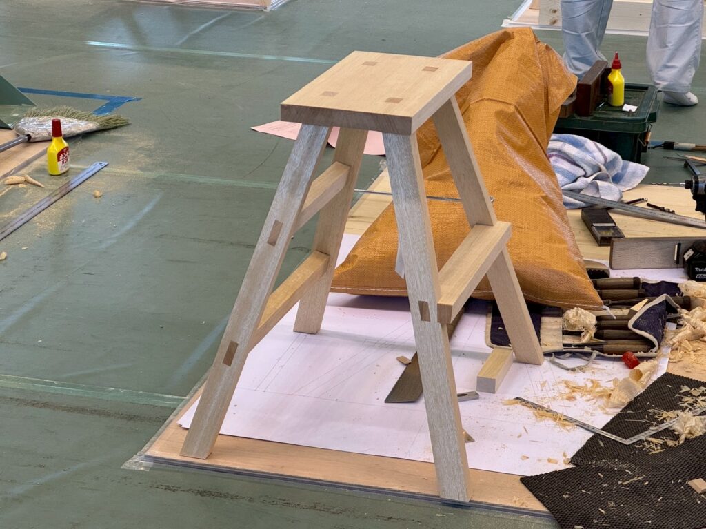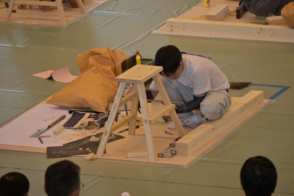 青年技能競技大会は、予選会・全国大会ともに、「四方転び踏み台」(写真のような脚立です)の製図・木づくり・組み立てまで全工程を制限時間内に完成させ、その完成度を競うものです。