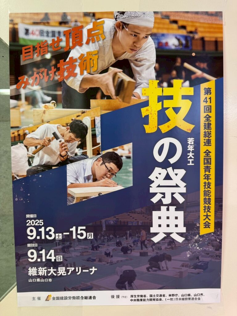 2025年9月14日に山口市「維新大晃アリーナ」で開催された「全国青年技能競技大会」に、匠弘堂宮大工の谷本・稲葉・上野が出場しました。